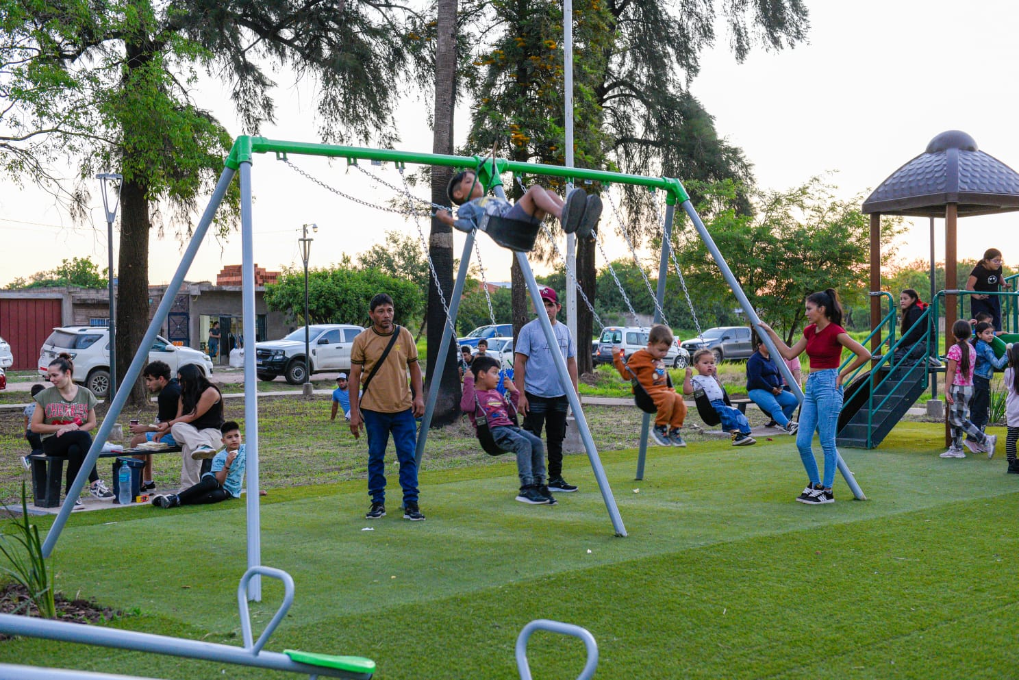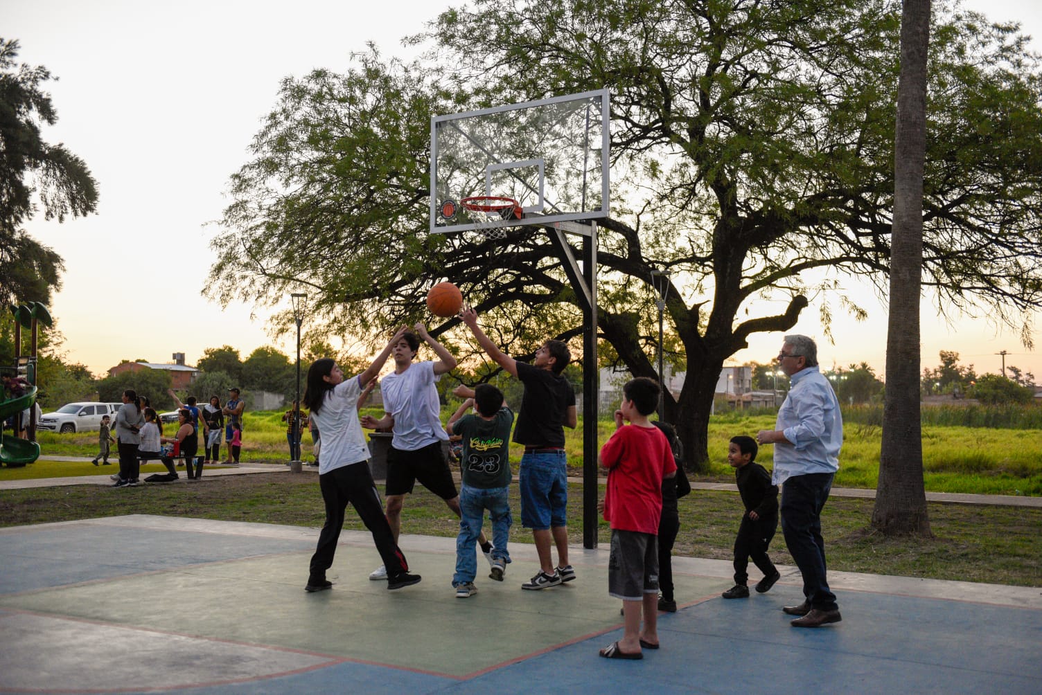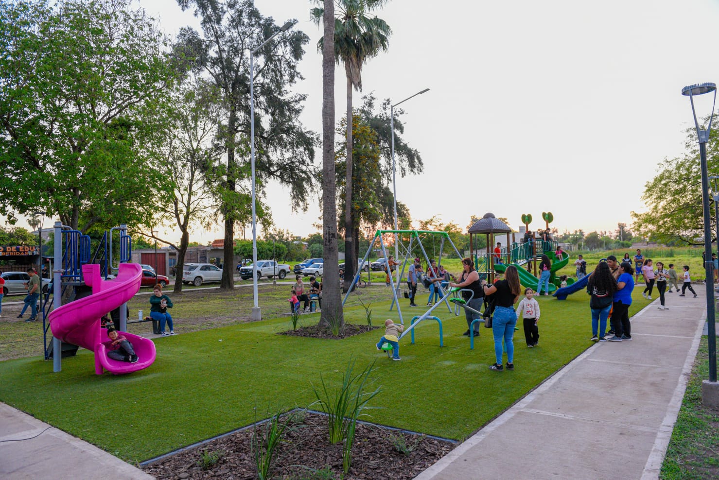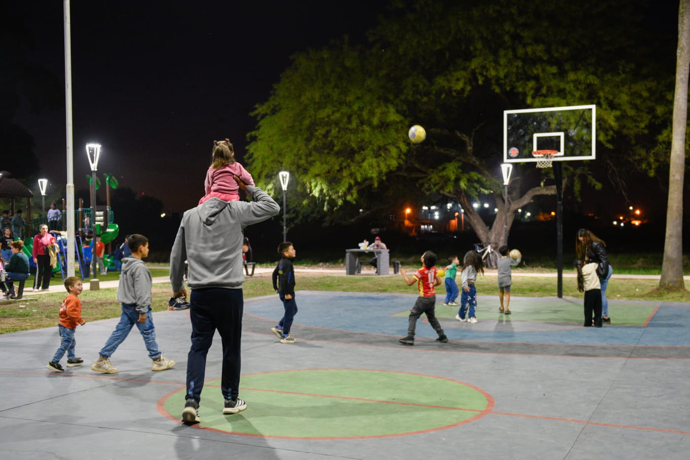 La renovada plaza cuenta con luminarias leds, mobiliario urbano, parquizado, sendas peatonales, juegos infantiles, estación saludable y cancha de básquet.