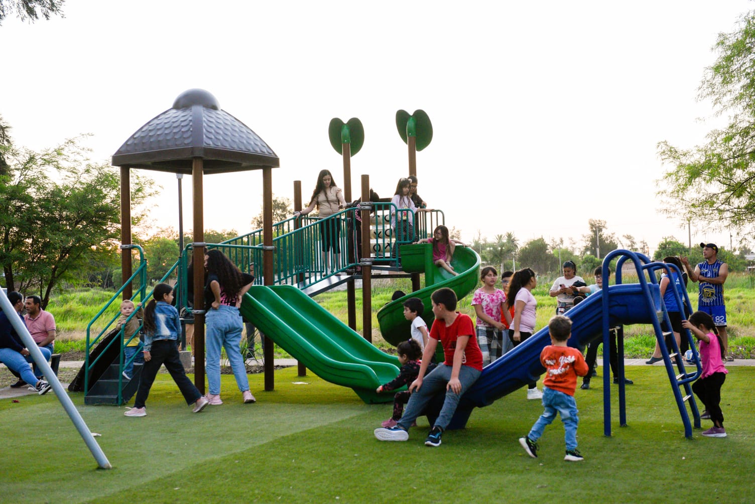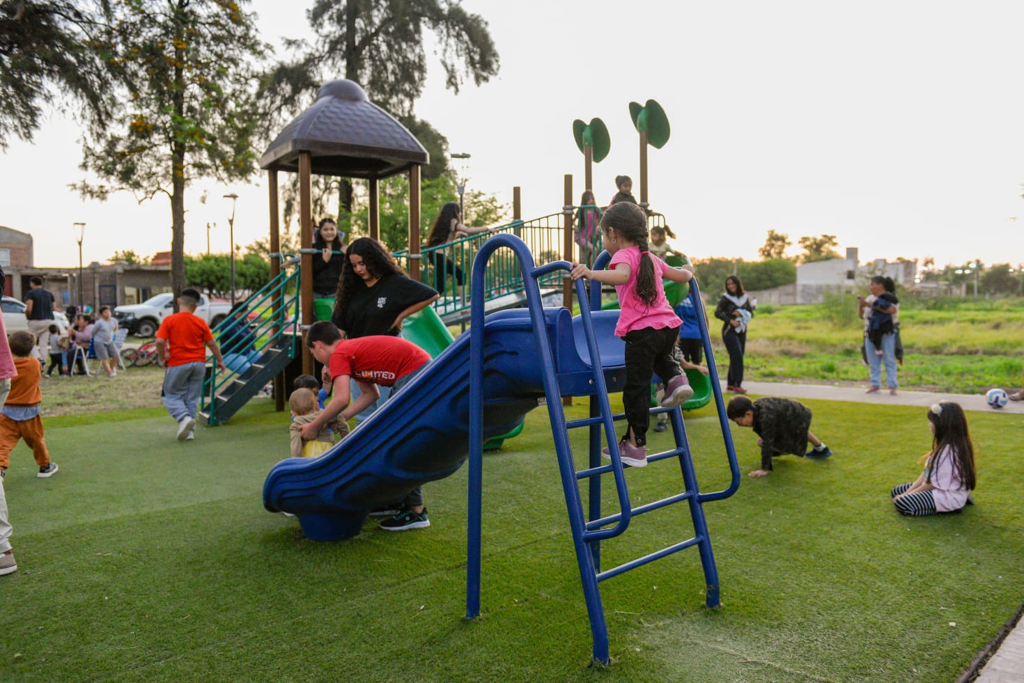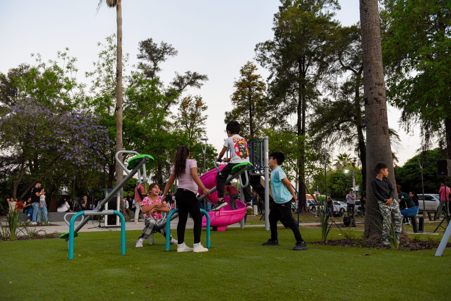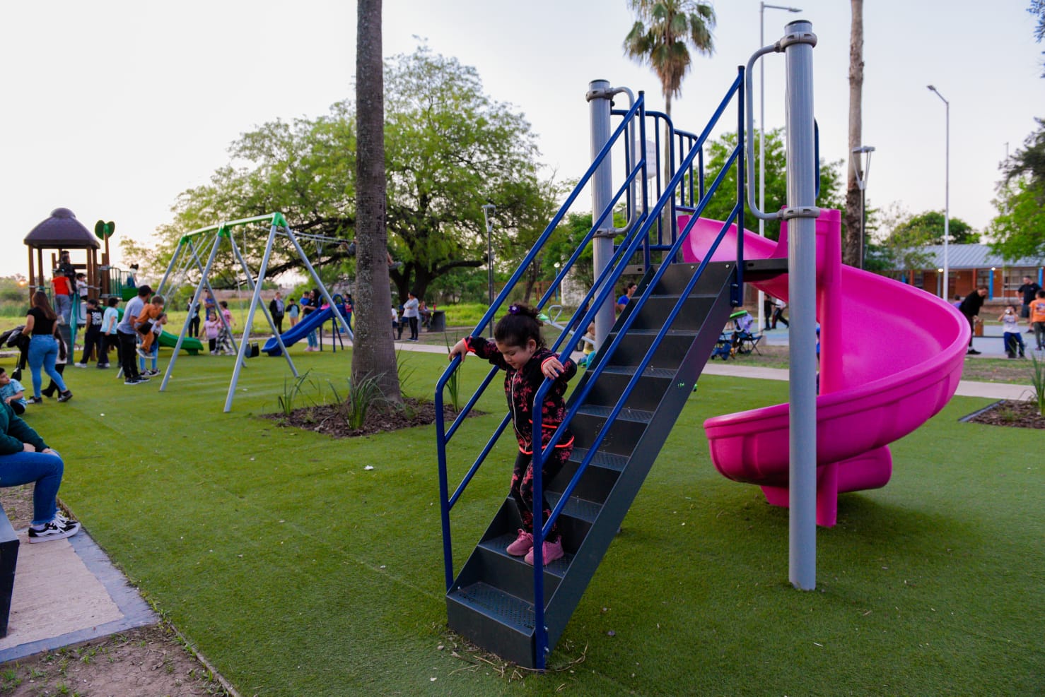 La renovada plaza cuenta con luminarias leds, mobiliario urbano, parquizado, sendas peatonales, juegos infantiles, estación saludable y cancha de básquet.