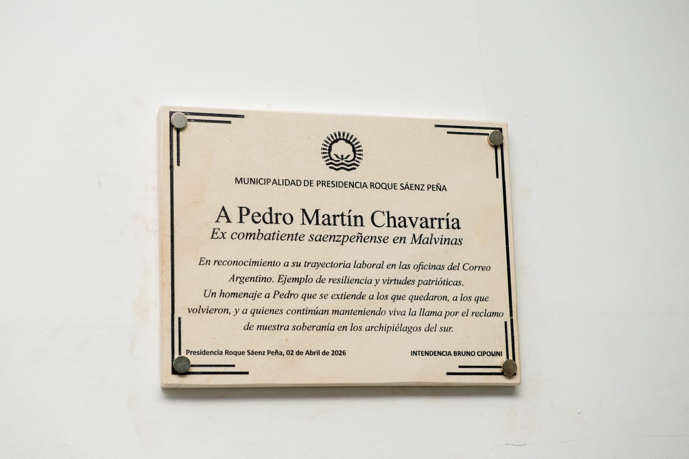 En las instalaciones de la sede local del Correo Argentino, el municipio de Presidencia Roque Sáenz Peña reconoció al ex combatiente de Malvinas, Pedro Martín Chavarría, quien también fue empleado del Correo desde agosto de 1985 hasta el año 2005.