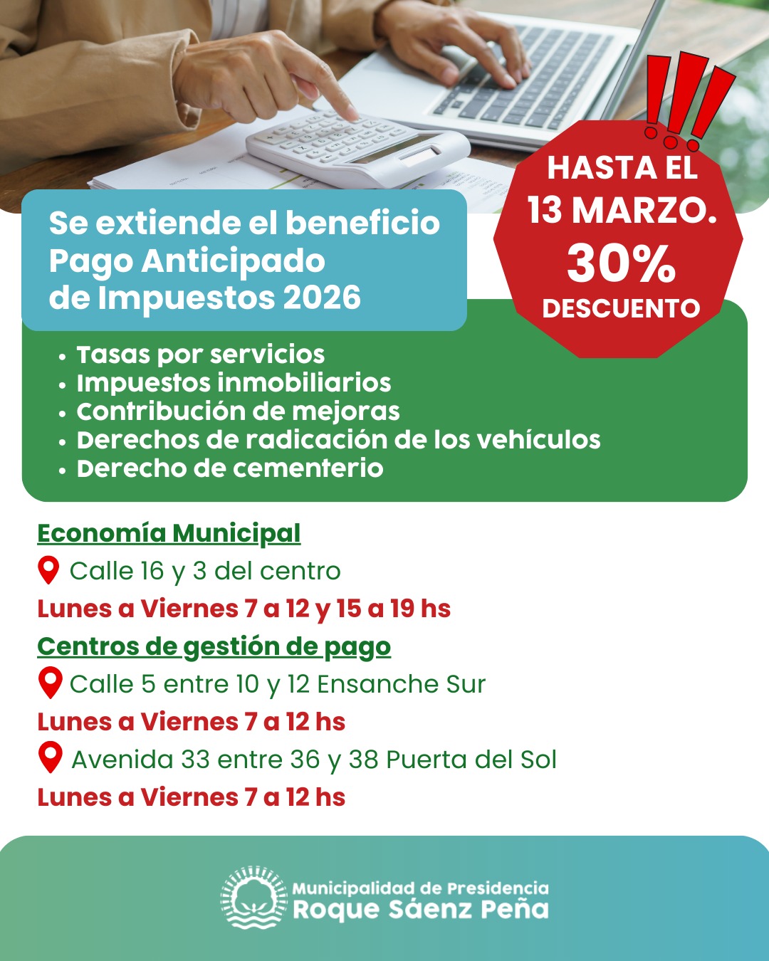 Con el objetivo de que todos los contribuyentes puedan ponerse al día con el pago de los impuestos, el municipio a través de la Secretaría de Economía informó que hasta el 13 de marzo se extiende el plazo para acceder al 30% de descuento en el pago anticipado de los tributos 2026.Hasta esa fecha los vecinos podrán acceder al 30% de descuento en el pago de los tributos. Los mismos pueden ser abonados de forma presencial o por canales electrónicos a través de la página del municipio.El beneficio, que sigue vigente hasta el viernes 13 de marzo, rige para todos los contribuyentes que estén al día con las obligaciones vencidas al 31 de diciembre del 2025 o con la cuota al día del plan al cual haya accedido hasta esa fecha y paguen la totalidad de los tributos 2026 de: impuesto inmobiliario, tasas por servicios, contribución de mejoras, patentes, derecho de radicación de los vehículos en general y derecho de cementerio.